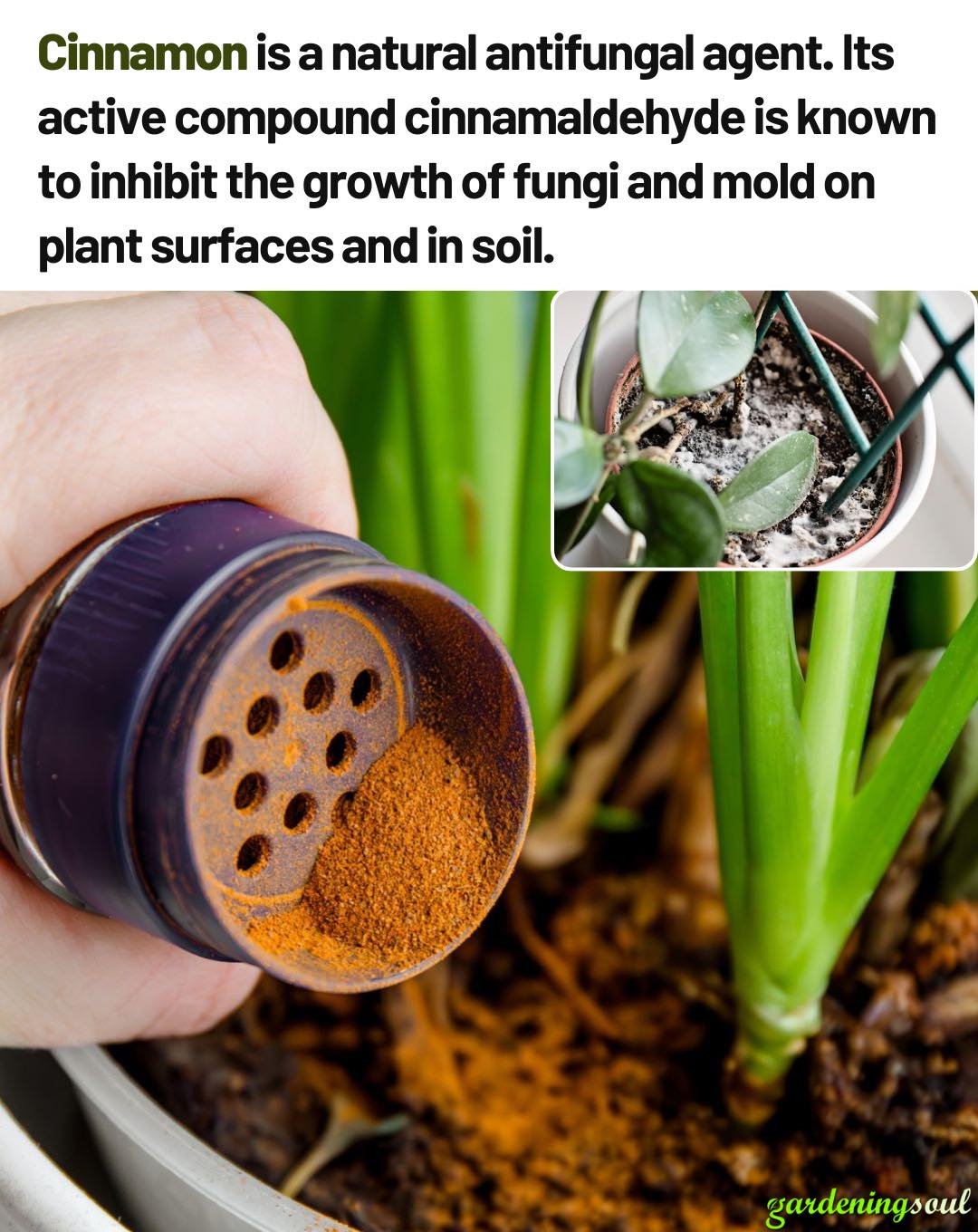 Cinnamon is a natural antifungal agent. Its active compound cinnamaldehyde is known to inhibit the growth of fungi and mold on plant surfaces and in soil.
