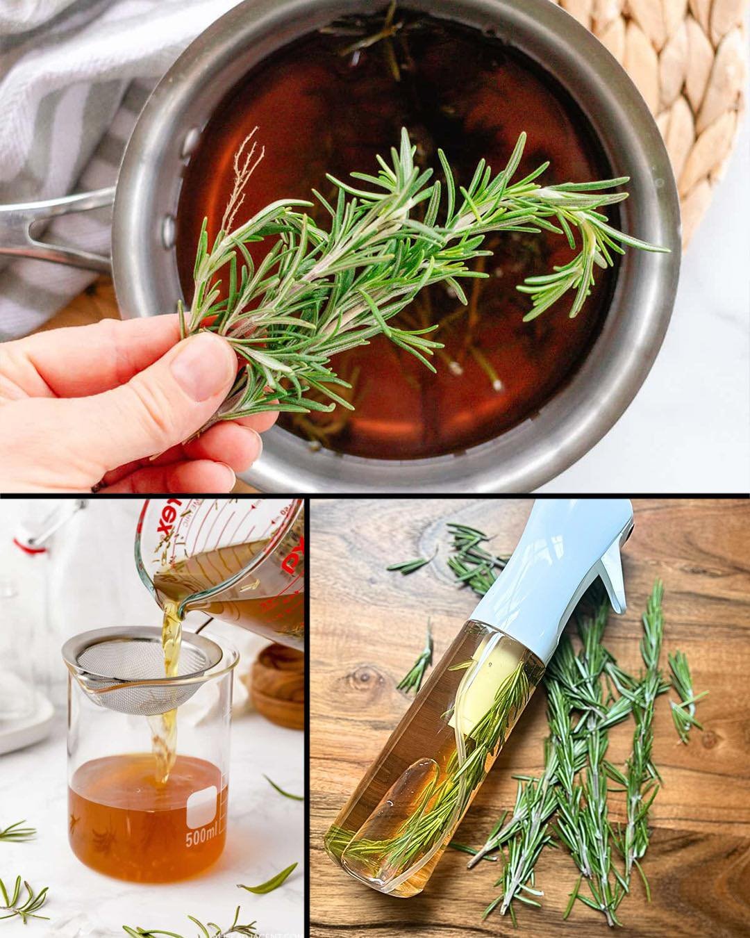 - Once infused, strain the oil through a cheesecloth or fine strainer to remove the rosemary.