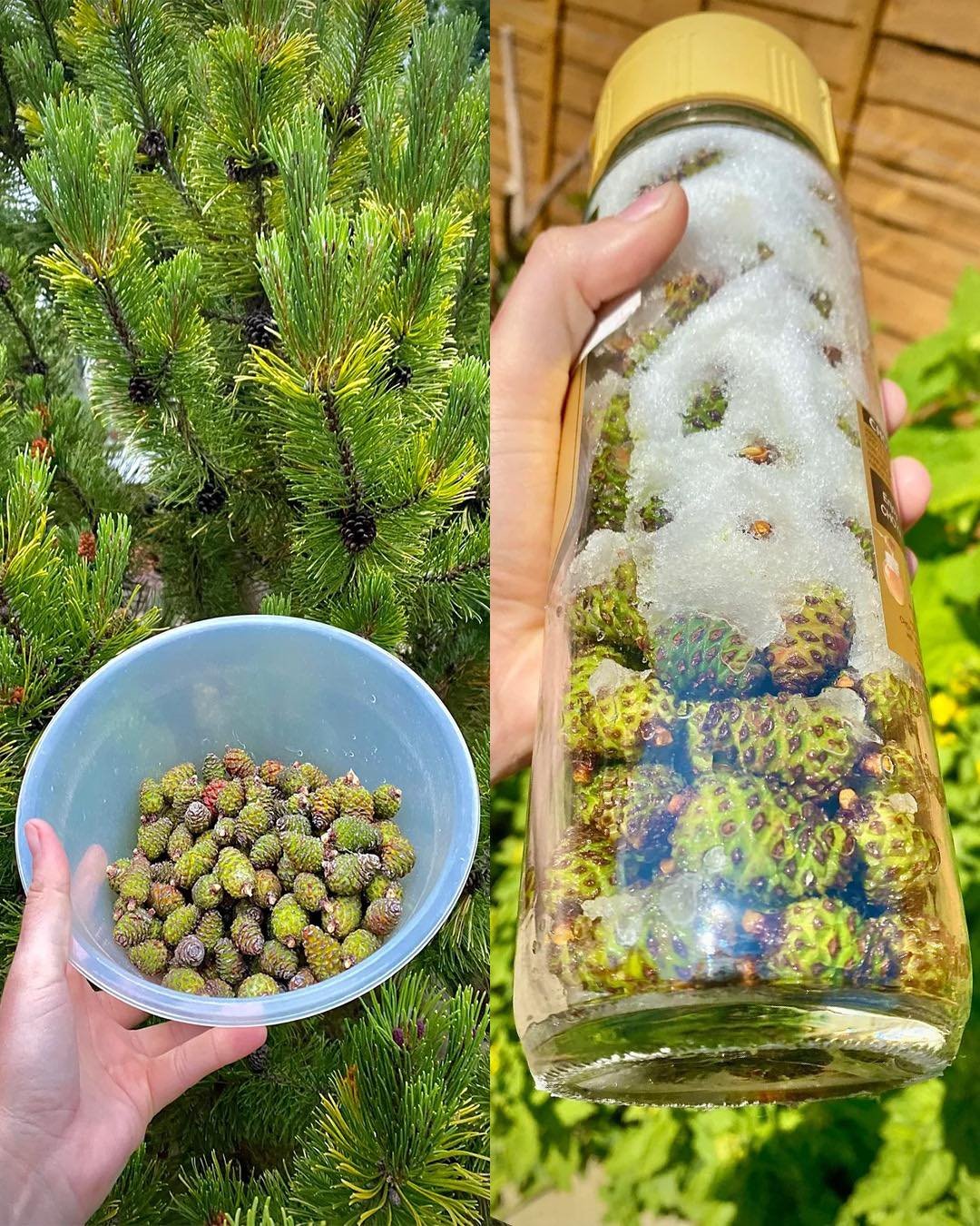 In a clean jar, layer clean, dry green cones with sugar in a 1:1 ratio by weight (e.g., 500 g cones + 500 g sugar). End with a sugar layer.