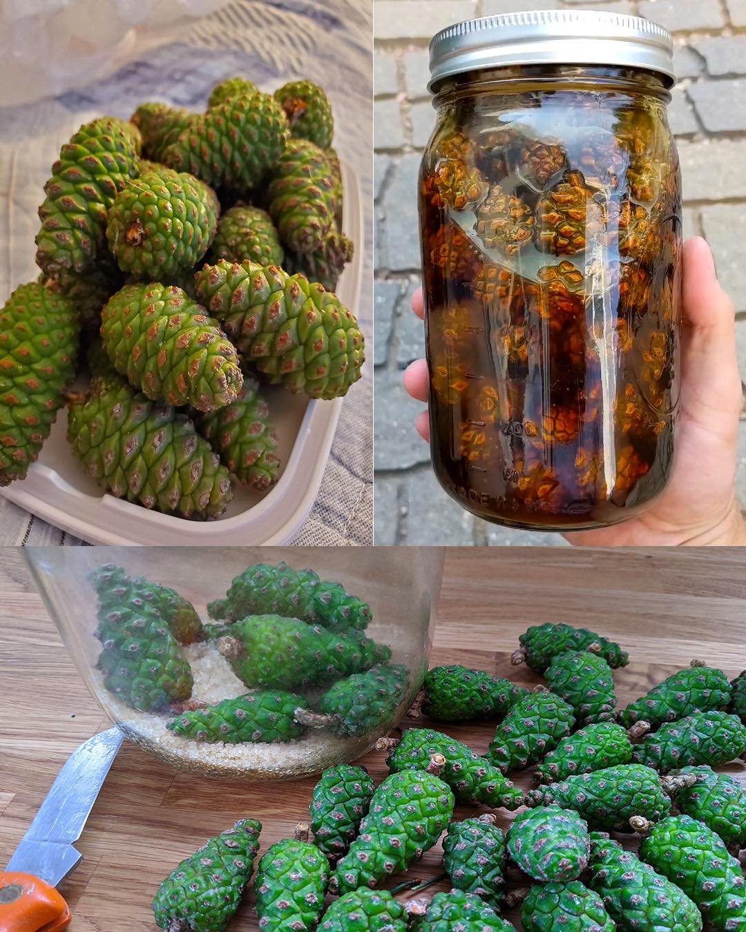 In a clean jar, layer clean, dry green cones with sugar in a 1:1 ratio by weight (e.g., 500 g cones + 500 g sugar). End with a sugar layer.- Optional: a few lemon slices between layers.