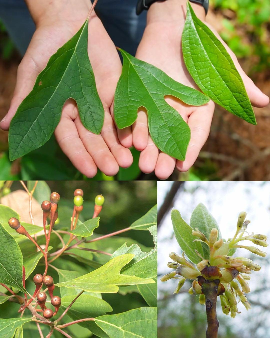 Sassafras (Sassafras albidum) is a tree or shrub known for its unique three-shaped leaves and aromatic properties. It thrives in the Southeast United States but can also be found in other regions.