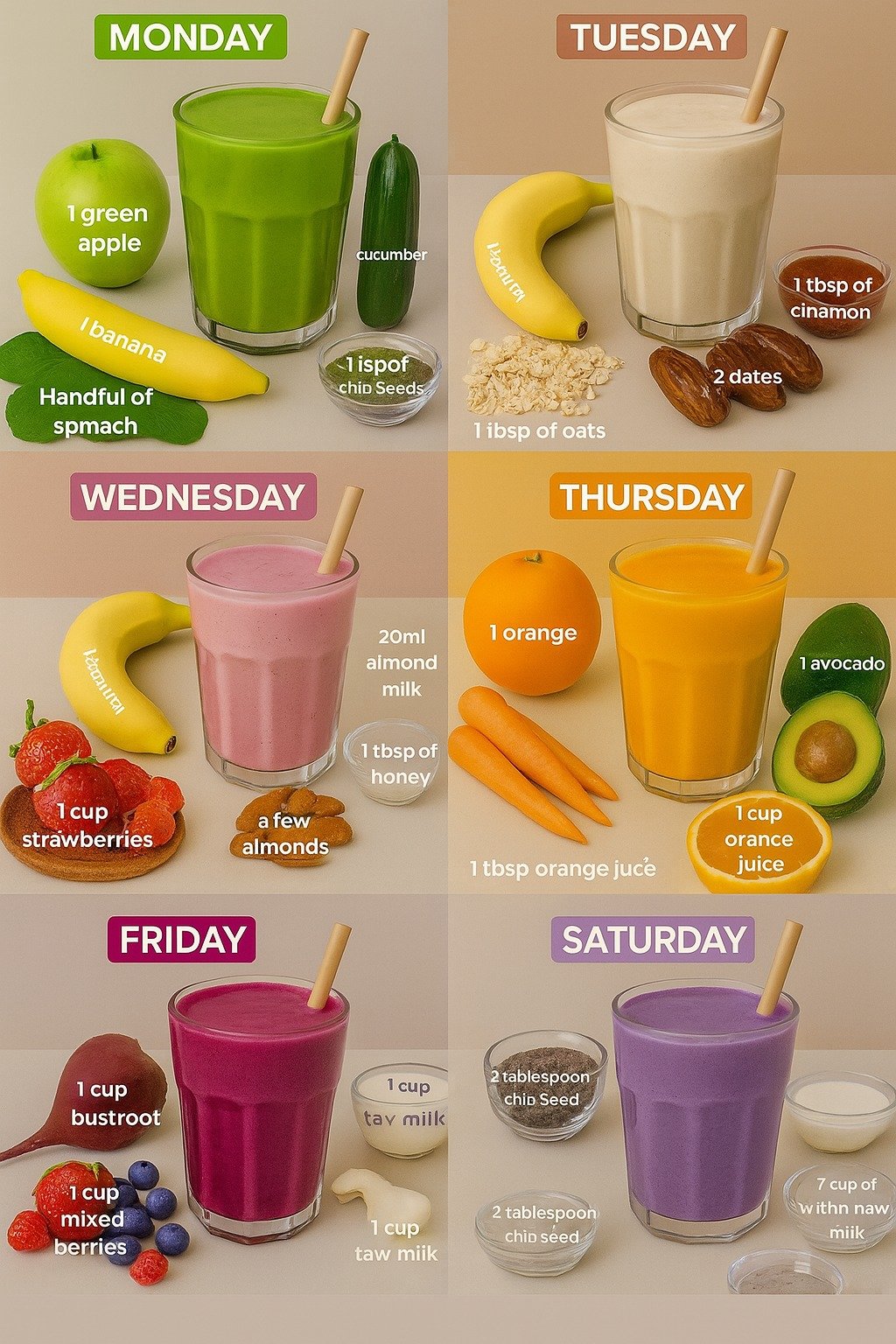 Transform your mornings with a burst of flavor and vitality using this 6-day smoothie plan designed to kickstart your wellness journey. Whether you’re battling fatigue, seeking immune-boosting foods, or aiming to detox the body naturally, these nutrient-packed smoothies offer a delicious solution. Crafted with fresh, wholesome ingredients, this plan harnesses the power of fruits, vegetables, and seeds to support digestion, enhance energy, and promote radiant skin. From Monday’s green detox blend to Saturday’s antioxidant-rich purple delight, here’s how to use this smoothie regimen in the most natural and effective way to revitalize your health starting today.
