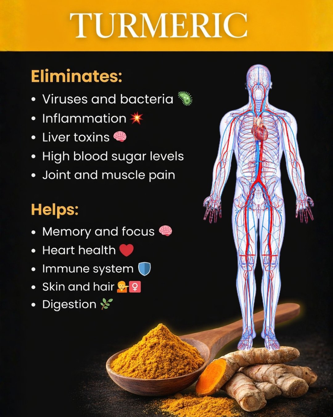 Turmeric is rich in antioxidants that strengthen the body’s defenses and improve immune response against viruses and bacteria. Regular consumption may help prevent common illnesses such as colds and flu.